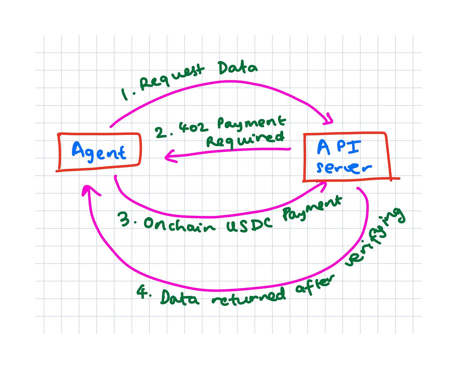 Here’s an example of what that might look like: a Wall Street analyst uses an agent to automatically access rich market data APIs across dozens of providers. The agent can make micropayments for only the specific data points it needs for its analysis. The agent’s stablecoin wallet is prefunded with $1000 (=1000 USDC), and it automatically negotiates pay-per-query rates with multiple providers in real-time.