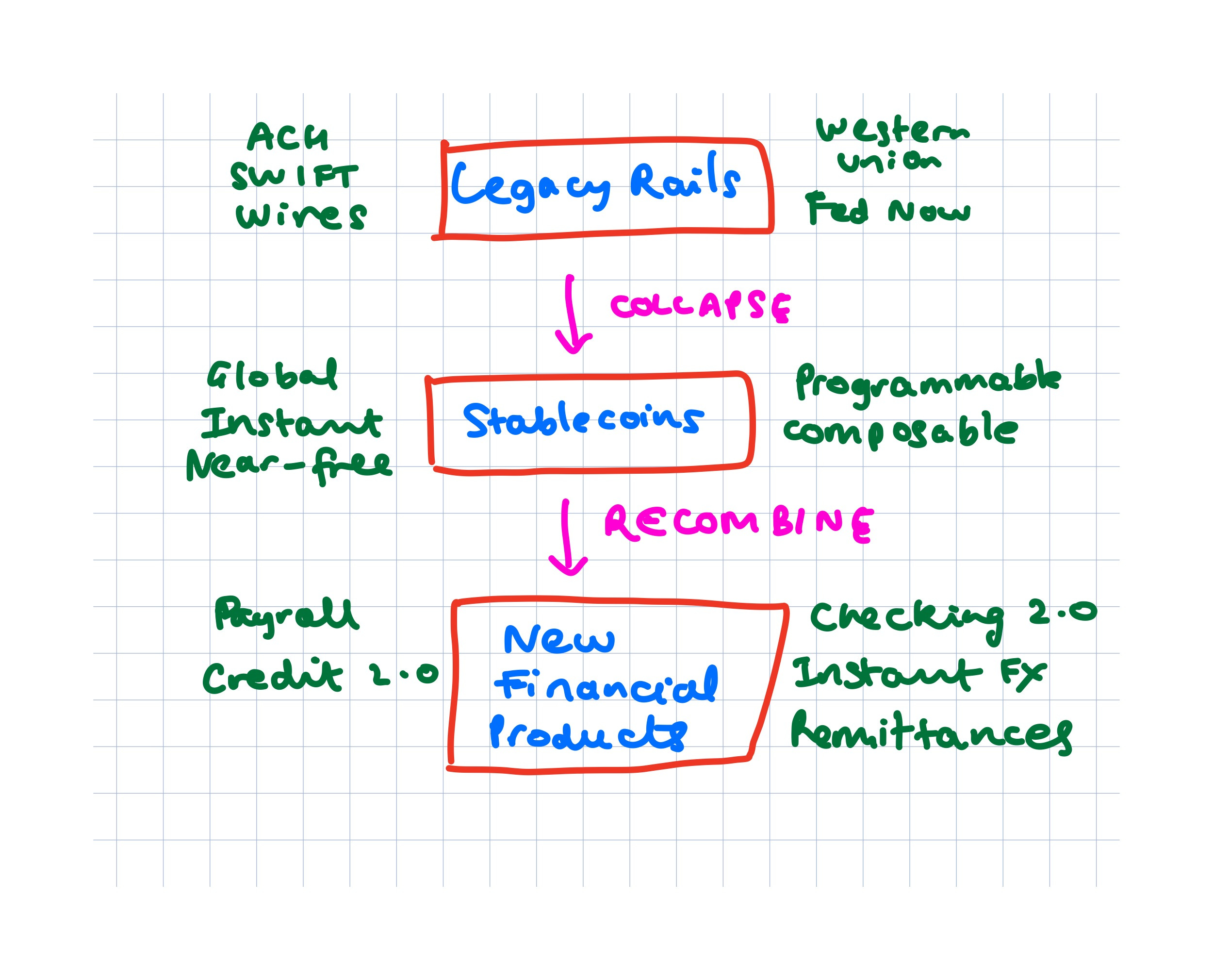 I think about stablecoins as powerful primitives that collapse an entire industry of legacy rails, like ACH, wire transfers, SWIFT, Visa, FedNow and others, into a single programmable unit. That programmable unit has the potential to become a building block to replace other legacy businesses previously built on money movement, like checking accounts, FX transfers, money market funds and credit. This is the new banking-as-a-service (BaaS) platform.