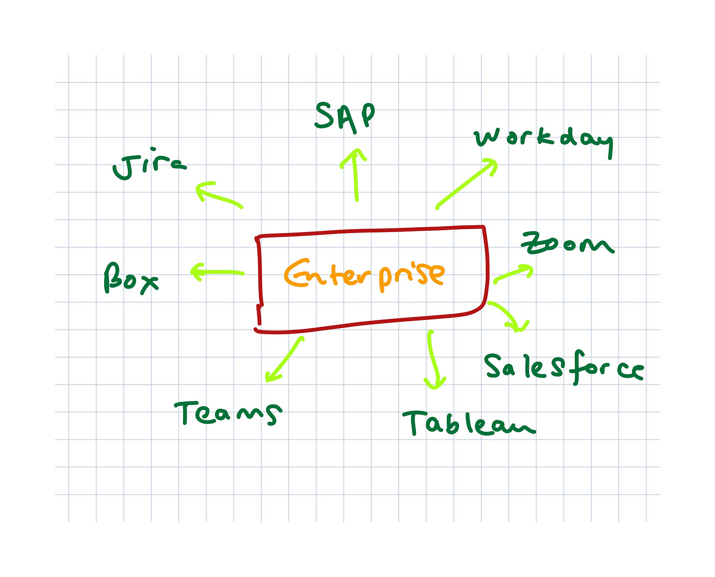 So the idea is the same, regardless of what type of business it is. Different pieces of the software stack perform different functions, like Google Workspace for email, Slack for messaging, Salesforce for CRM, Workday for HR, Asana for project management.