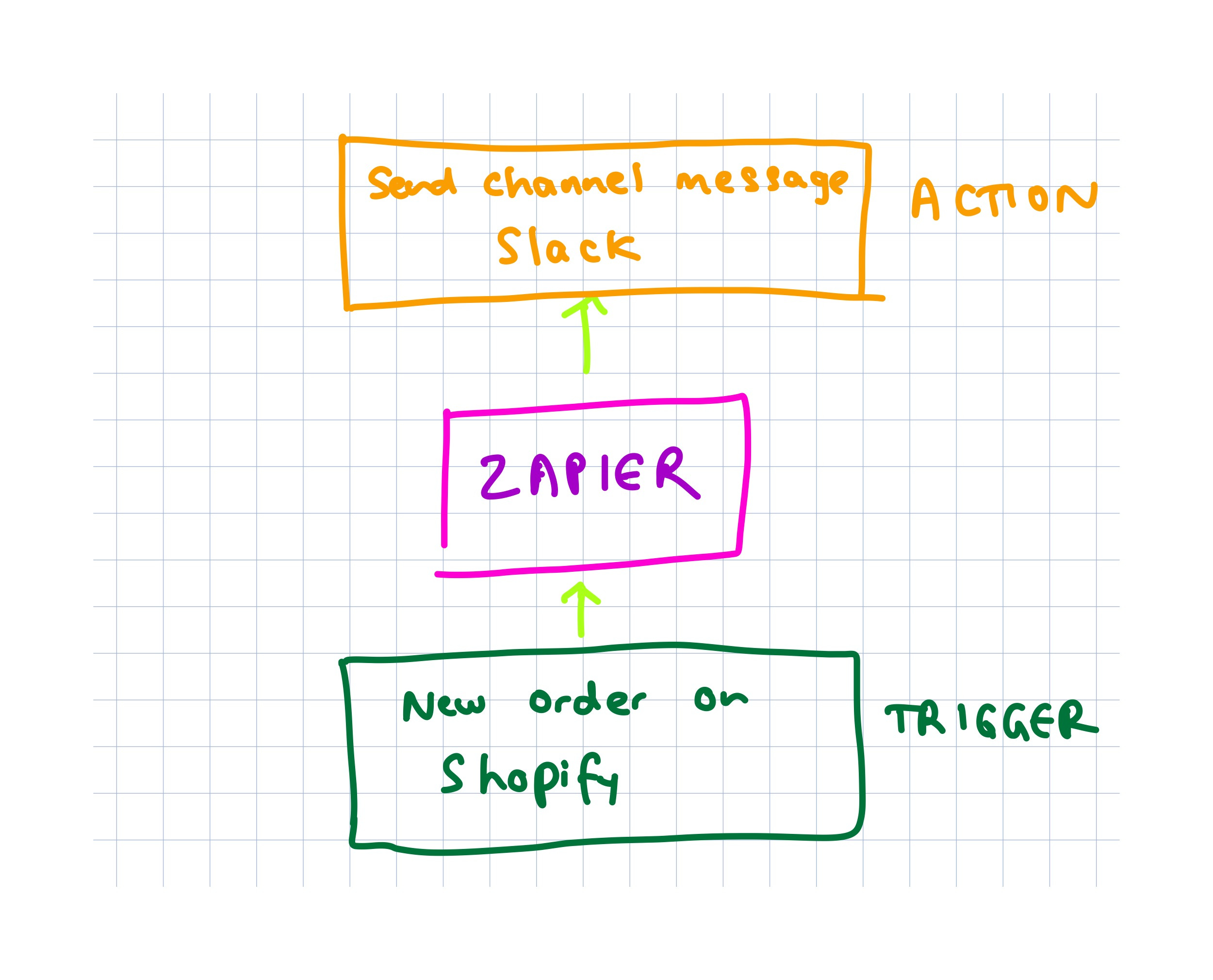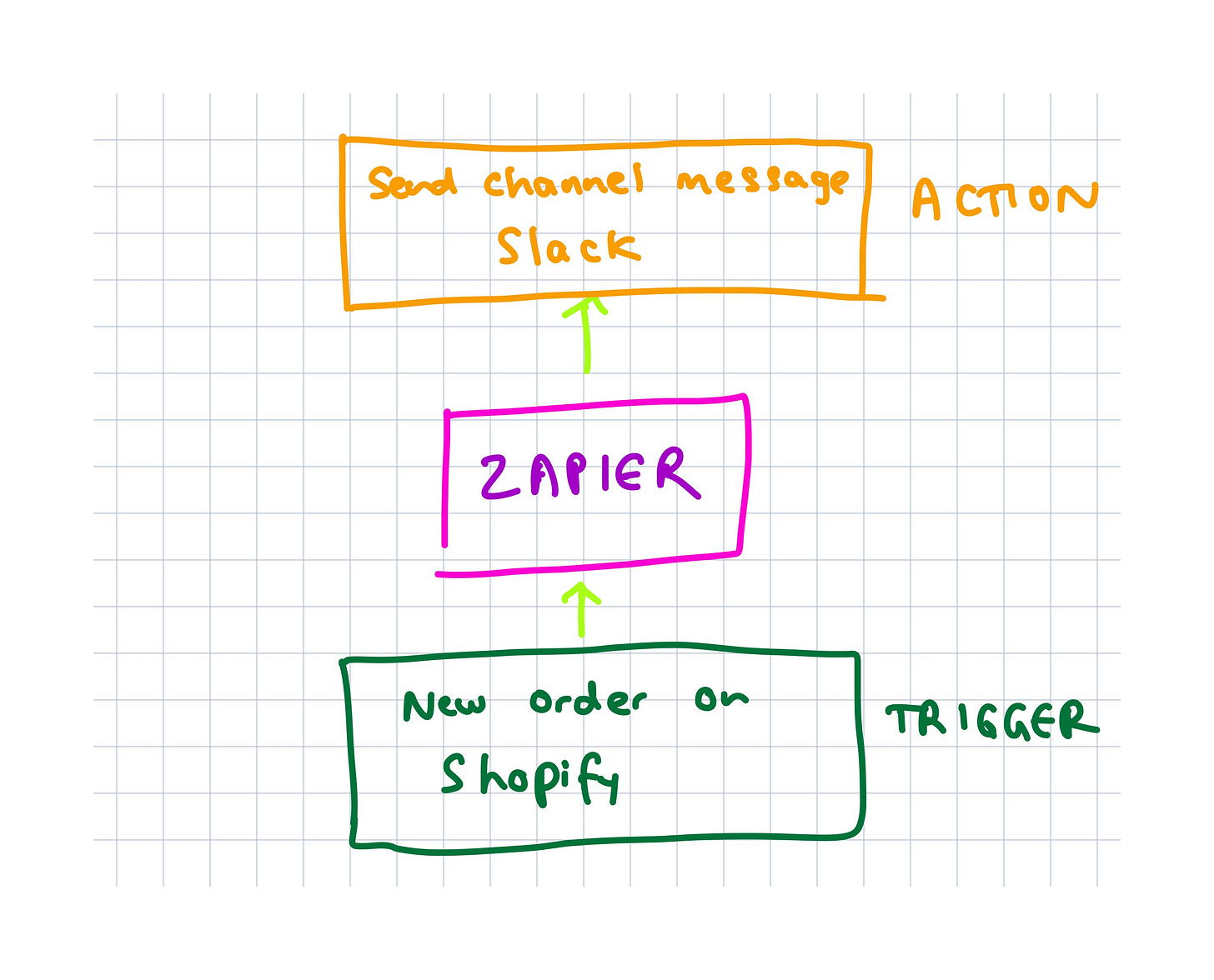 Let’s say you’re a small business that wants to communicate a new sale, recorded through Shopify, to your team Slack channel. This is what a simple Zapier workflow might look like: